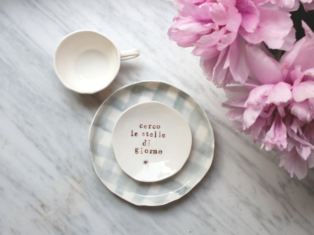 I know you have beautiful poetry inside your heart, ready to pour out. These small plates are like your Moleskine: think a few verses (8-10 WORDS) and I will stamp them on your plate, using lovely vintage stamps. Available in 2 sizes: tea and dessert. It will be the perfect gift for you or your beloved ones, being a unique and totally customized one-of-a-kind piece. So let your immagination blossom and remember to write your word/sentence in the NOTE WINDOW located in your shopping cart!