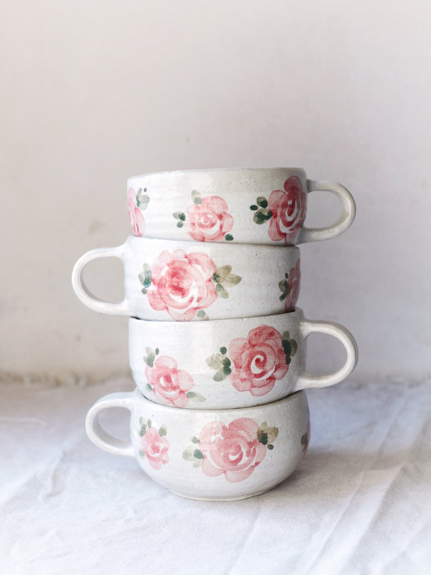 A surprising cup! Do you know why? Because you can cherish it with both hands: one on the handle and the other one embracing its sweet roundness as you sip your warm tea or cocoa. And if that is not enough, find comfort in those delicate litle roses, painted one by one and let them bring the spring to your table, no matter the season. This cup is made on the wheel, it's a rustic and sturdy stoneware coated with a very resistant transparent glaze, 100% dish washer safe.